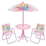 Disney Princess Patio Set Perfect for indoor or outdoor use, our Kids Only. Patio Set includes 2 Folding Chairs, Table and Umbrella. Tubular steel construction with color coordinated plastic parts. Easy Adult Assembly - No Tools Needed. Recommended weight limit 60 lbs (27 kg). Perfect for indoor or outdoor use, for Kids Only. Patio Set includes 2 Folding Chairs, Table and Umbrella. Tubular steel construction with color coordinated plastic parts. Easy Adult Assembly - No Tools Needed. Recommended weight limit 60 lbs (27 kg). Table 19.75 " X 18.25" H.. Chair 15.3" W X 14.6D X 20.6 H.. Umbrella 37.5 W X 37.5" D 55.5 "H . Tubular steel construction Washable plastic tabletop Easy adult assembly (no tools required) Weight Limit 60 lbs (27 kg) 35 x 20 x 57 inches ; 8 pounds 10.3 pounds